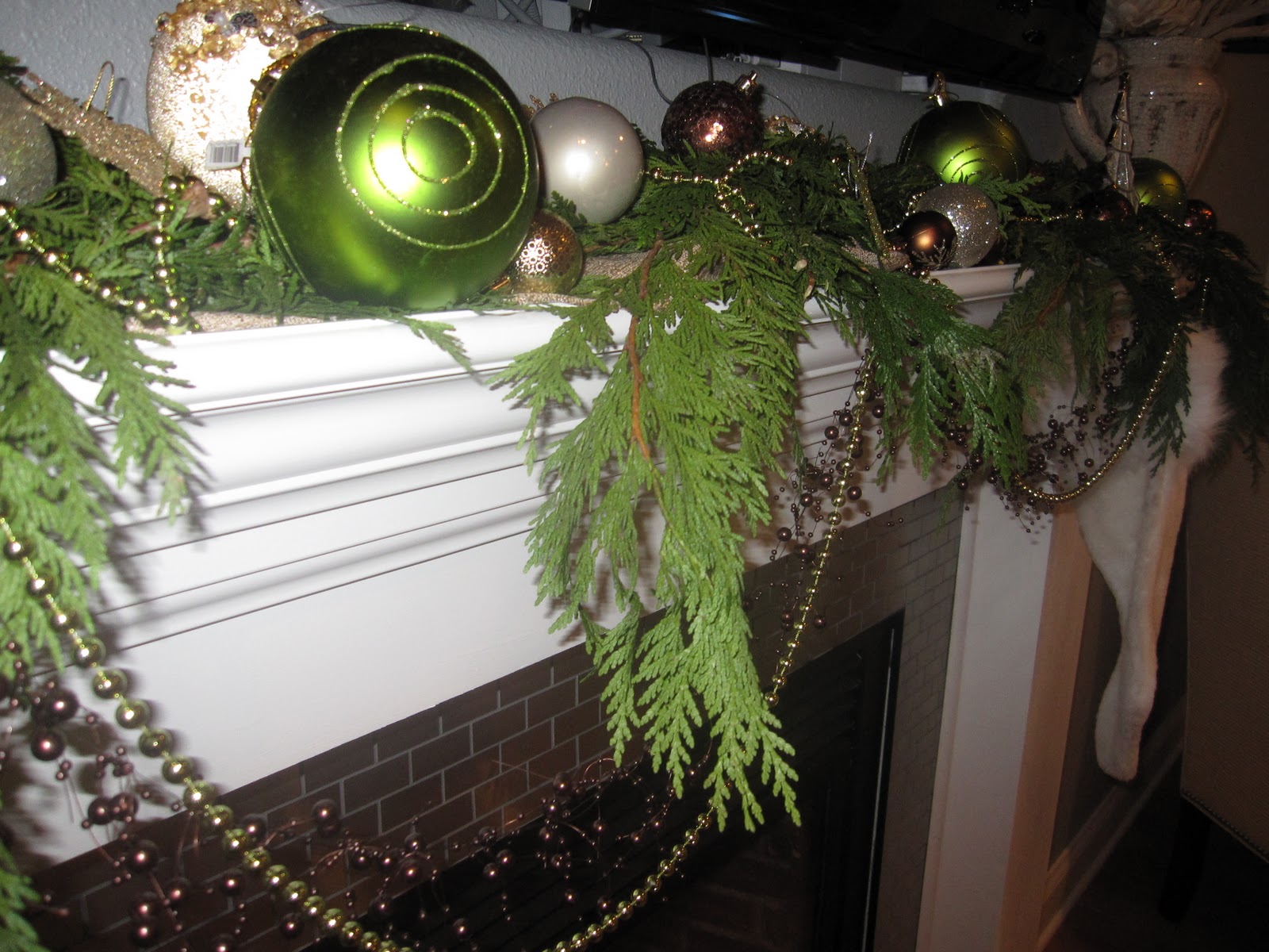 Next, I took some pretty brown beads I had found and did two swoops in the front, simply taping the ends to the mantel. I followed that with another swoop of lime green beads. This provide a little extra glam in front, and would be framed up nicely by the stockings I hung later.